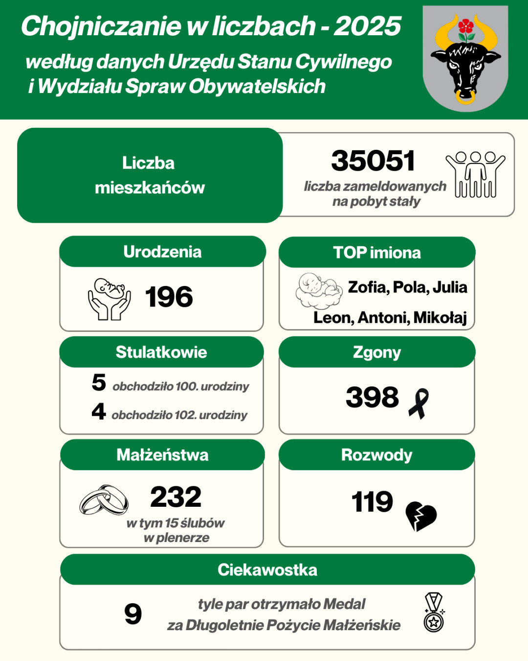 W naszym mieście na pobyt stały zameldowanych jest ponad 35 tys. mieszkańców. W tym roku urodziło się 196 dzieci, a najczęściej nadawane im imiona to Zofia, Pola, Julia oraz Leon, Antoni i Mikołaj. Odnotowano 232 małżeństwa, w tym 15 ślubów plenerowych. Pożegnaliśmy 398 osób. To liczby, które tworzą codzienność Chojnic.