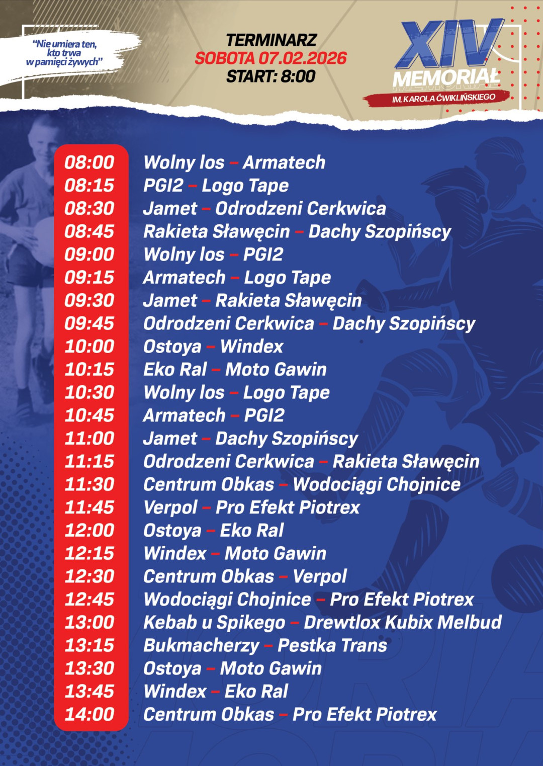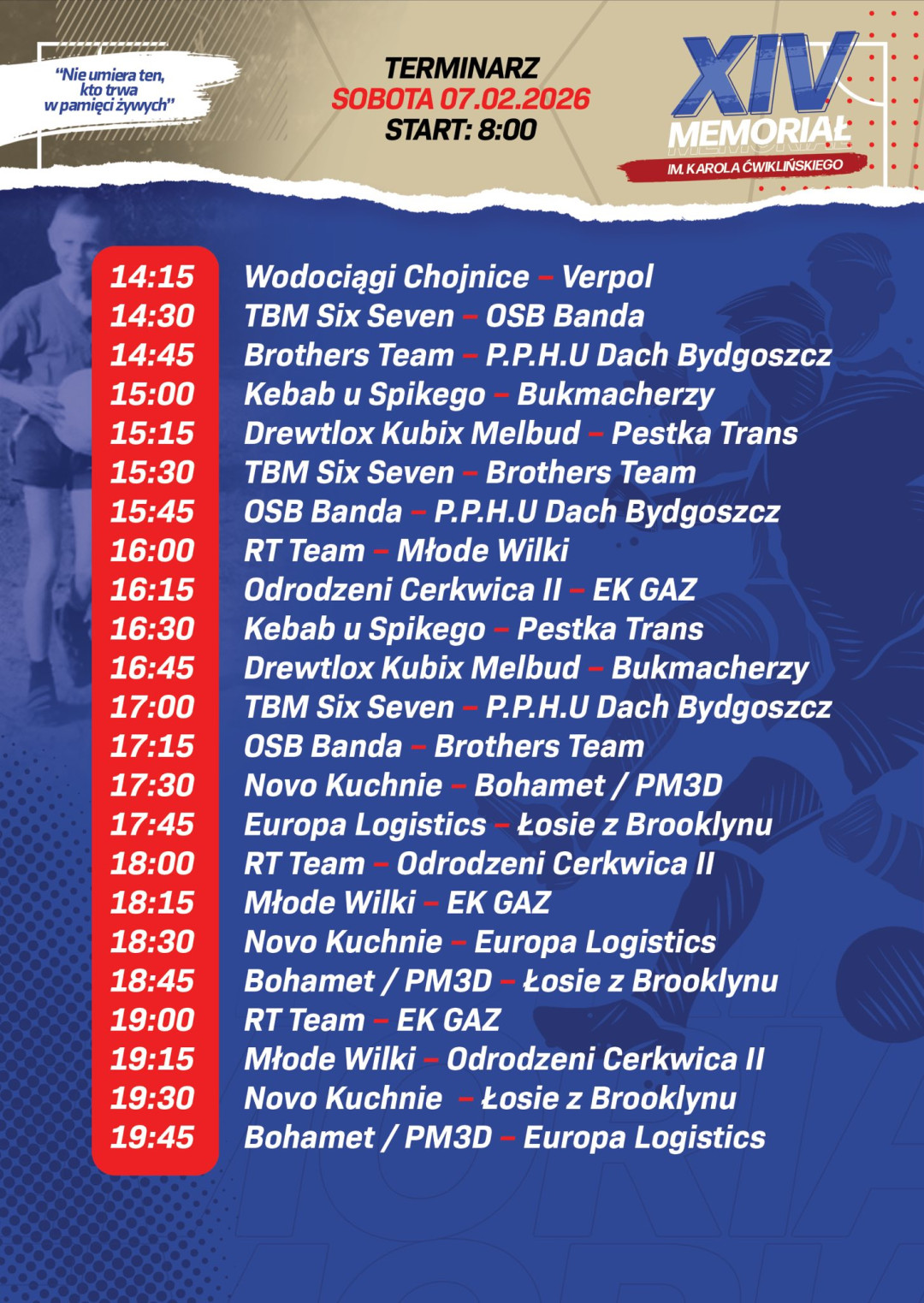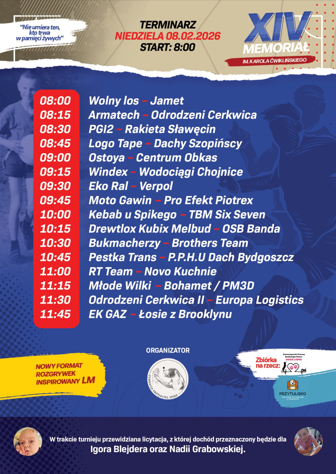 Nadchodząca 14. edycja odbędzie się 7-8 lutego w hali widowiskowo-sportowej w Chojnicach. To będzie kolejny wyjątkowy weekend pełen emocji, sportu, przyjaźni i dobra. Nasz cel pozostaje ten sam, upamiętnić Karola, promować sport, pomagać tym, którzy potrzebują wsparcia.