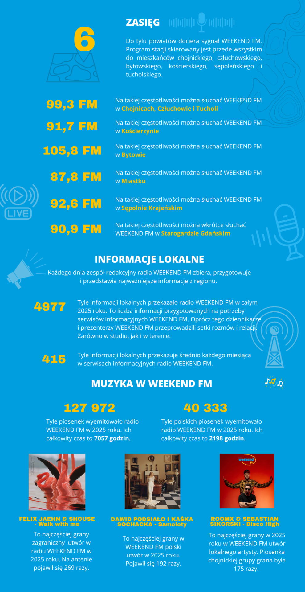 Każdego dnia jesteśmy dla Was w sześciu powiatach: chojnickim, człuchowskim, bytowskim, kościerskim, sępoleńskim i tucholskim. Wkrótce zagramy także w Starogardzie Gdańskim. Weekend FM możecie słuchać również w swoich telefonach oraz internecie.