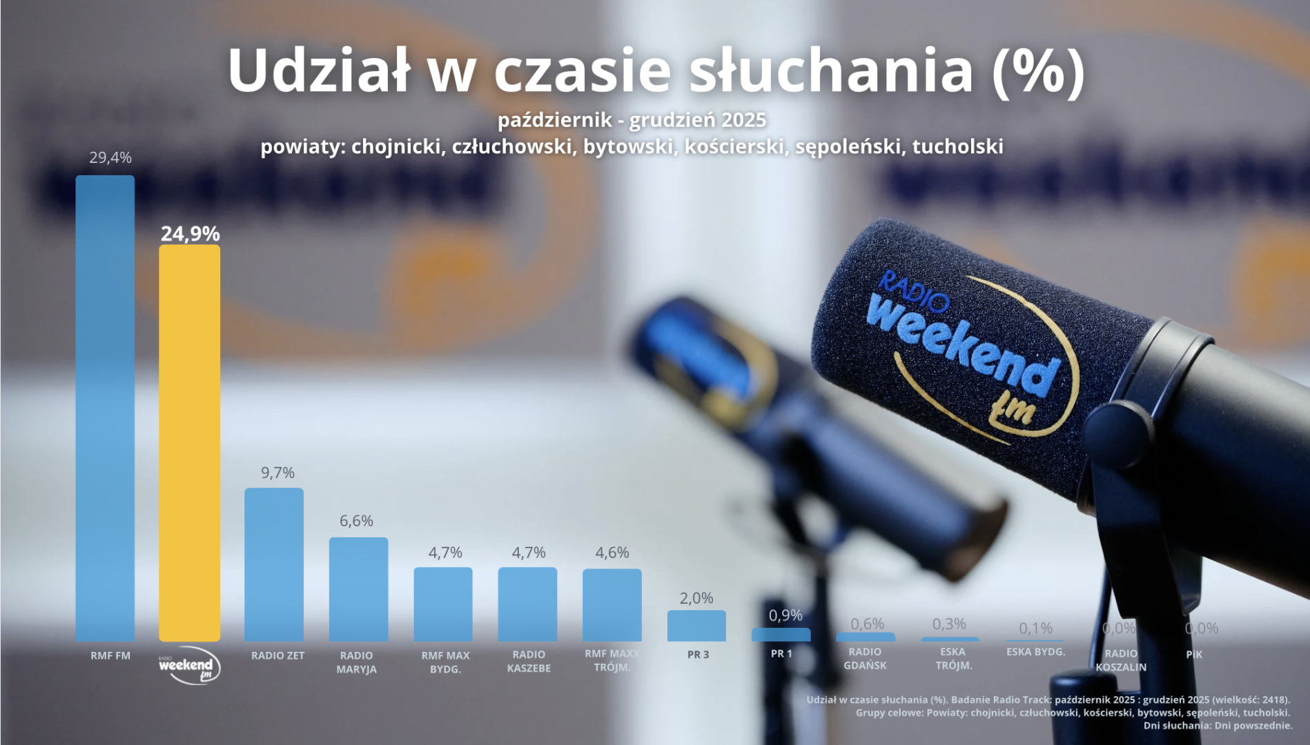 Jak pokazują ostatnie badania słuchalności Radio Track, które przeprowadza Kantar Polska, Weekend FM w swoim zasięgu jest najczęściej wybieraną stacją regionalną. W okresie od października do grudnia 2025 roku łącznie w powiatach chojnickim, człuchowskim, bytowskim kościerskim, sępoleńskim i tucholskim Weekend FM cieszyło się prawie 25 procentowym udziałem w czasie słuchania. To plasuje nas na pierwszym miejscu wśród wszystkich lokalnych i regionalnych stacji słyszalnych w naszym regionie.