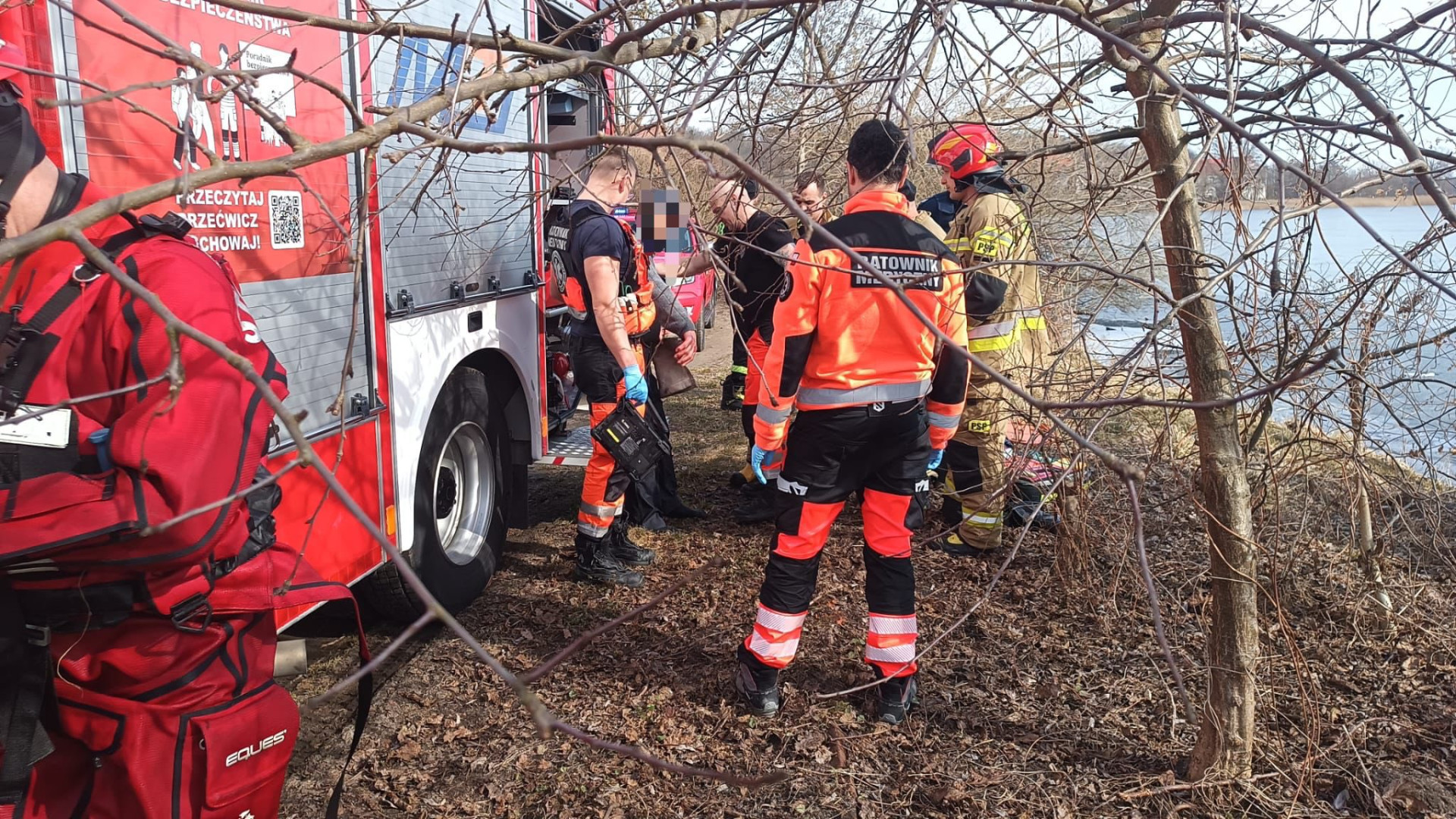 Na miejscu interweniowali policjanci, ratownicy medyczni oraz pięć zastępów straży pożarnej. Właśnie strażakom udało się wydobyć mężczyznę na brzeg.