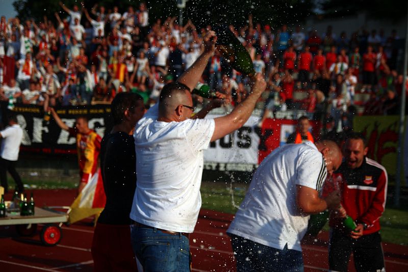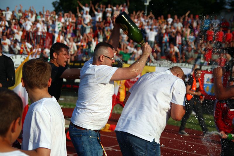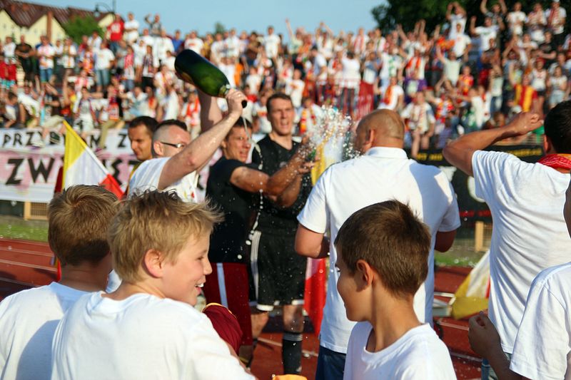 Najpierw radość na stadionie, potem na chojnickim rynku. Kibice, piłkarze i mieszkańcy świętowali wygraną Chojniczanki i udane zakończenie sezonu piłkarskiego dla chojnickiej drużyny. Były szampany, śpiewy, podziękowania i wielka feta: