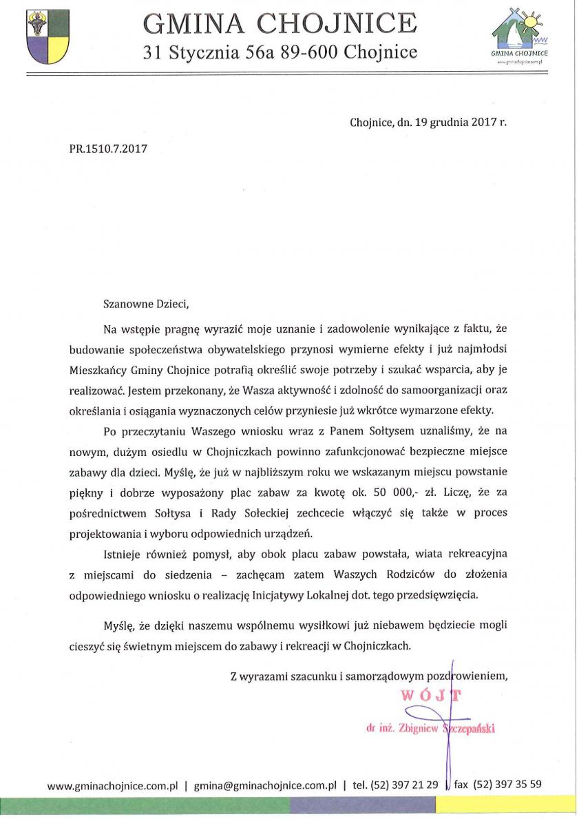 Dzieci doczekały się odpowiedzi od wójta Zbigniewa Szczepańskiego. W specjalnym liście zapowiedział on, że plac zabaw na osiedlu w Chojniczkach powstanie już w przyszłym roku, a mali mieszkańcy będą się mogli włączyć w projektowanie i wybór urządzeń.