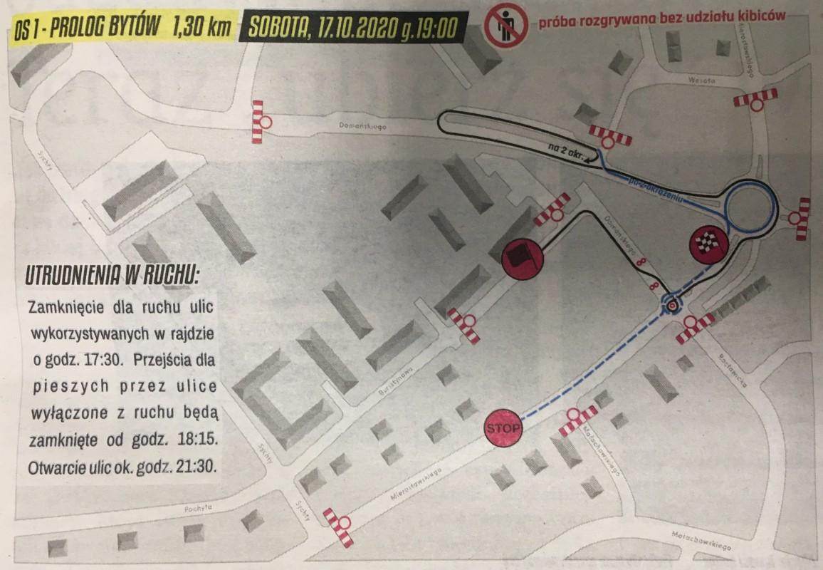 W tym roku prolog nocny zostanie rozegrany o godzinie 19.00 między ulicami: Bursztynowa, Sychty, Mierosławskiego i Domańskiego, a więc na bytowskich blokowiskach. Tu kibice, zgodnie z wprowadzonymi właśnie obostrzeniami, będą mogli oglądać rajd ze swoich okien domowych.